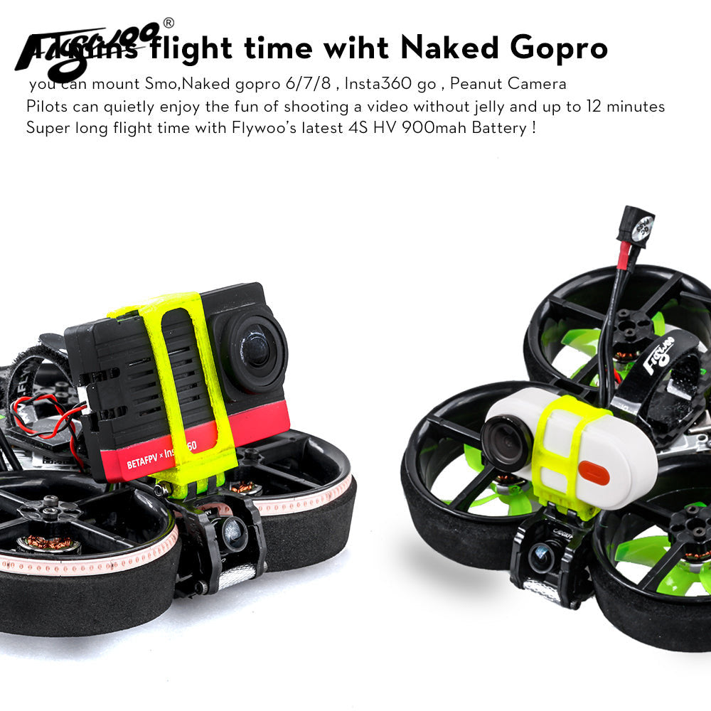 CineRace is double duct design , not a simple guard anymore. . It can fly as flexible as a racing drone, and as stable as Cinewhoop. Pilots can quietly enjoy the fun of shooting a video without jelly and up to 15 minutes Super long flight time with Flywoo's latest 4S HV 900mah Battery !