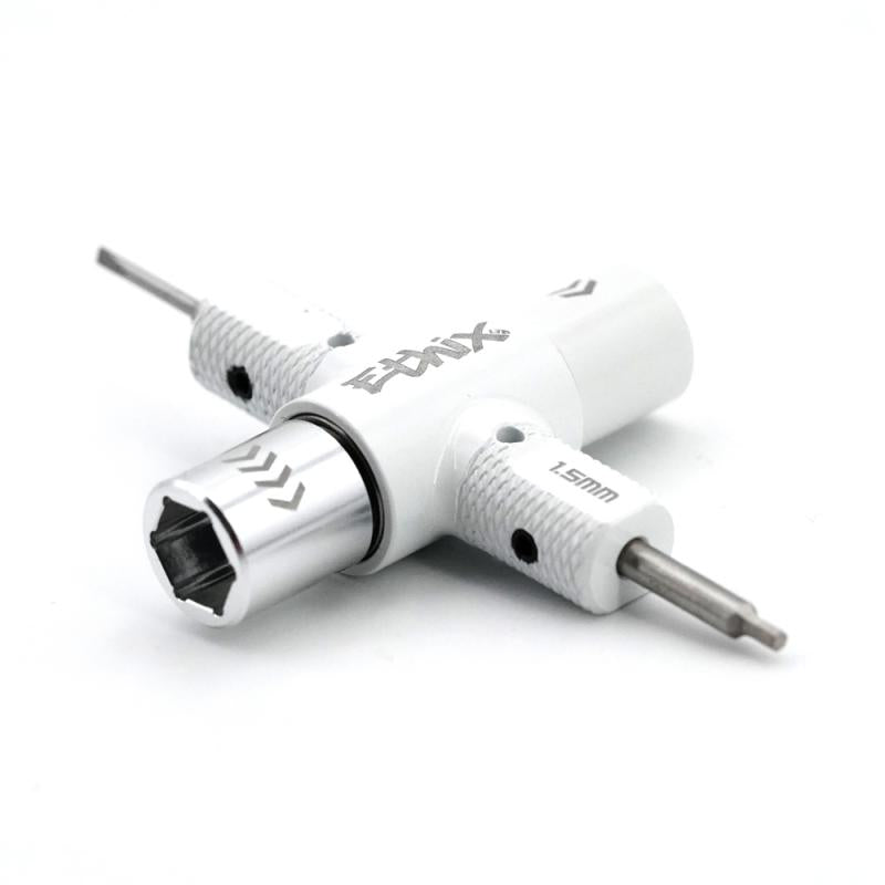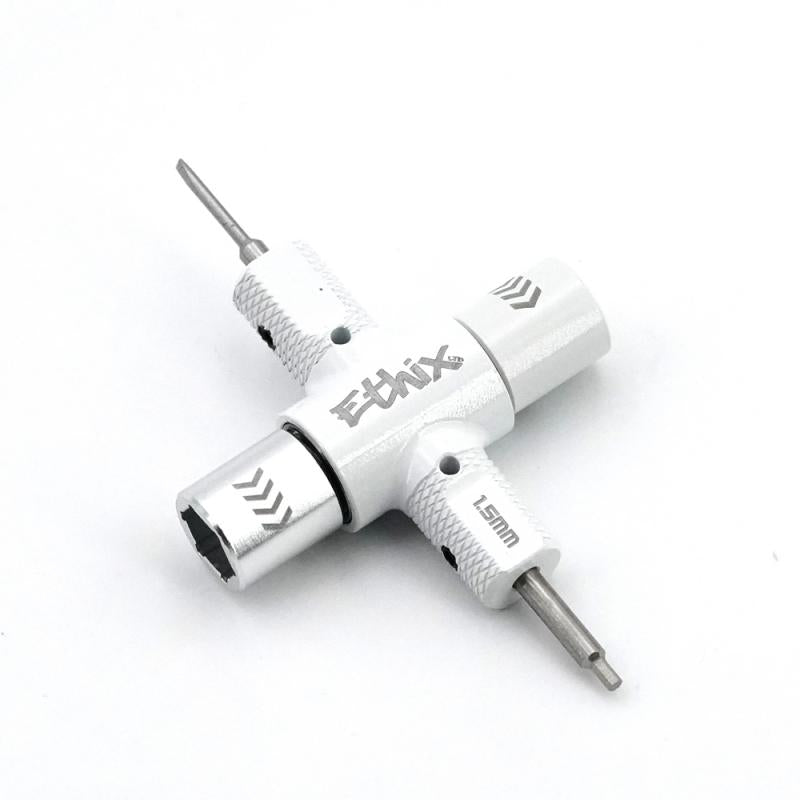 Have a gander at the new Ethix prop tool 1.5! Just like the original black tool there are two color coordinated 8mm smooth ratcheting wrenches (silver = loosening & black = tightening). As before two set screw removable tools on the perpendicular axis, which now consists of a 1.5mm hex & flat heat screw driver. You can’t have enough of these Ethix prop tools. Conveniently change props with ease and now the 1.5mm & flat head make servicing your bell replacements quicker than ever.