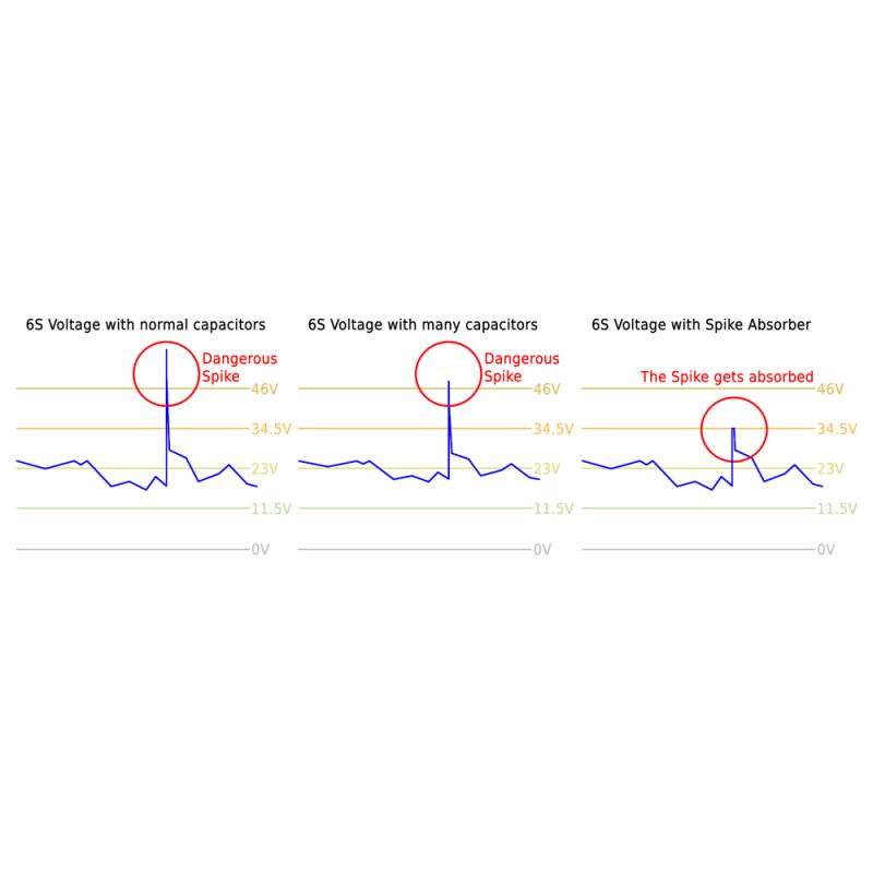 On electrical power systems using brushless motors, ESCs and LiPo batterys, high current and voltage peaks are common. The most known way to keep them in areas where they dont damage consumers that are connected to the battery is the usage of capaitors, which is in fact a good way. Capacitors dumpen any movement of the voltage. They store energy if the voltage rises and supply it when the voltage falls. But in some cases there are very short but high voltage spikes where capacitors are too slow. These spikes are mostly very short and appear in the area of some nano – microseconds, but can be easily the double or triple of the normal battery voltage. The most consumers survive a lot of them eaven if they are over their normal voltage rating. But if the spike is too strong, or it happens over a longer period, voltage regulators, capacitors and FETs can be damaged and fail. The Spike Absorber will absorb the energy of these spikes before they get in areas where consumers might get damage.