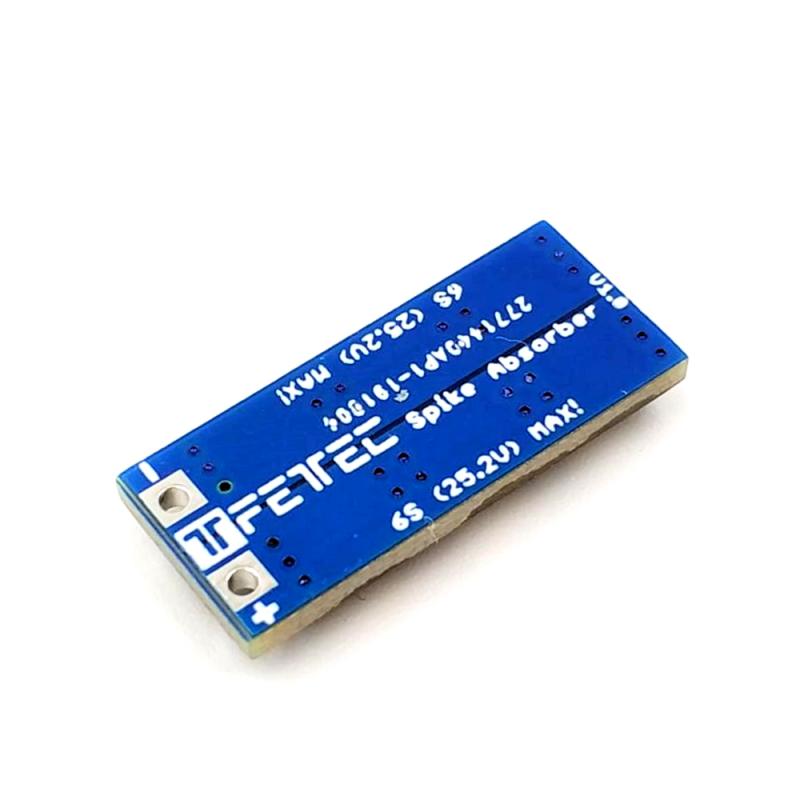The FETtec Spike Absorber uses well choosen TVS-Diodes to prevent the connected components being damaged by huge voltage spikes. The Spike Absorber is meant to be used in addition to a electrolyt capacitor. The capacitor can be mounted directly on top of it.