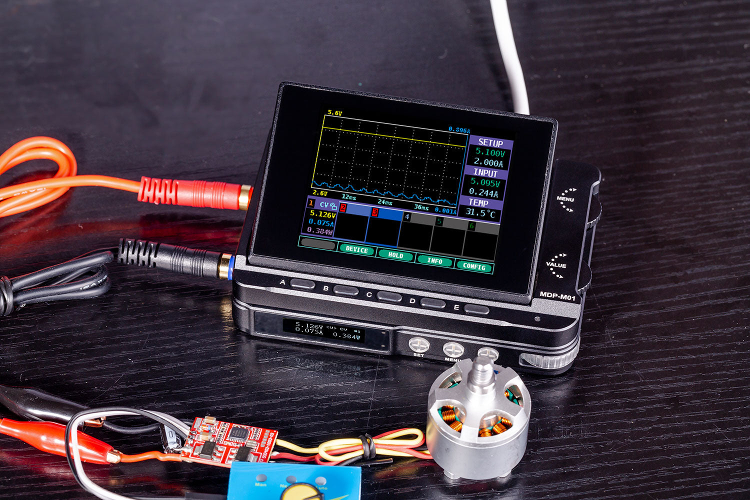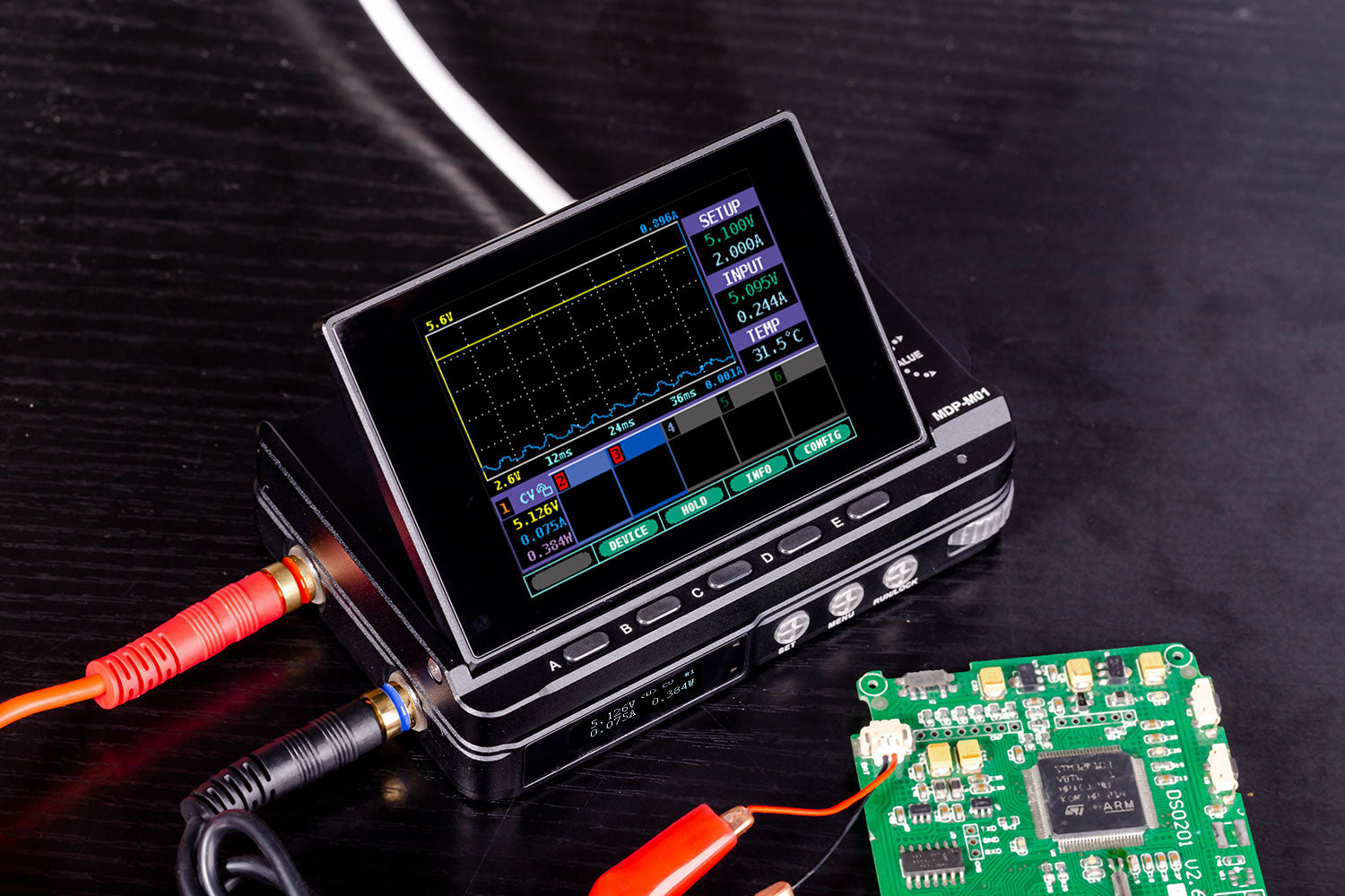 MDP-M01 Display Control Module: equipped with a 2.8-inch TFT screen, it can display the voltage-current waveform in real time, support data statistics, and automatically pair with and control six sub-modules (digital power modules), with dual thumb wheels and 90-degree scrolling user-friendly design.