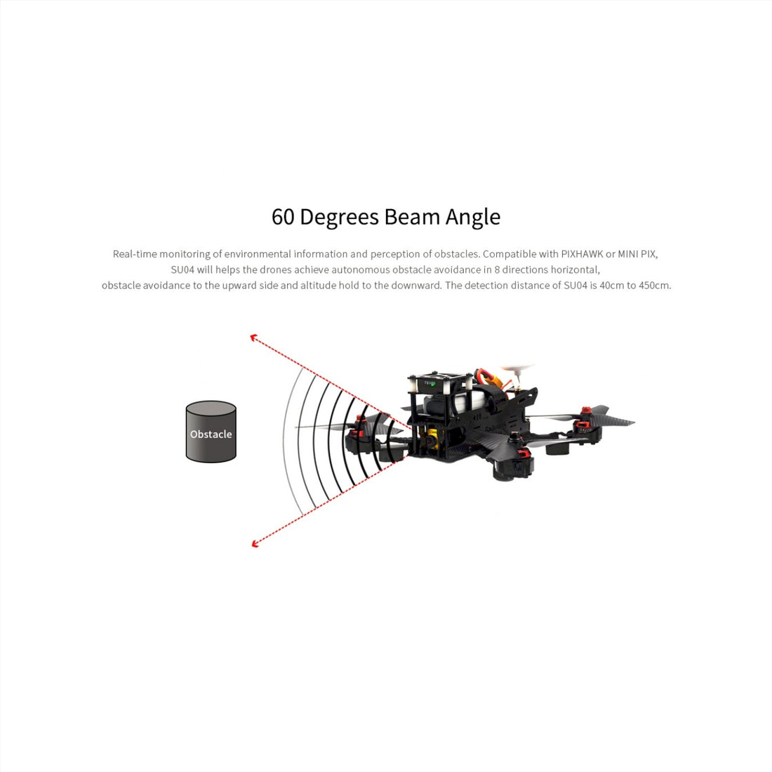 The RadioLink SU04 PixHawk Ultrasonic Sensor has a built-in 32-bit processor, with breakthrough software and hardware double filter technology which makes it having a 30ms fast response, accurate obstacle avoidance without delay, effective man-machine protection. It is compatible with PIXHAWK or MINI PIX, automatic identification the interface protocol of I2C, UART and MAVlink.