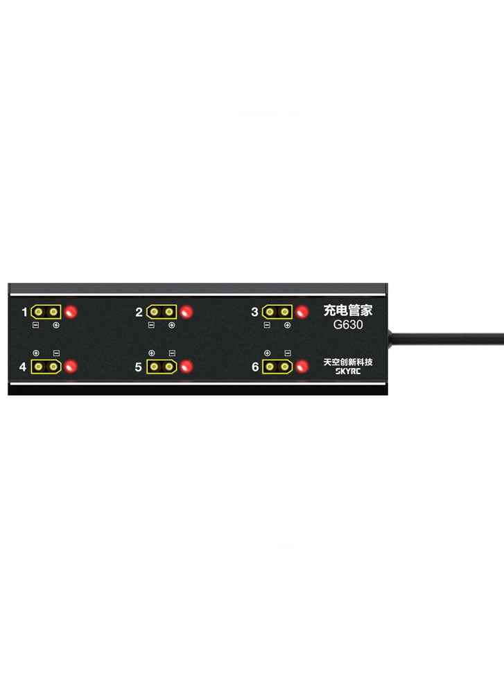 If you have lots of high capacity batteries to charge, the SkyRC G630 automatic charge board is for you. It makes charging multiple batteries much more convenient. In combination with the SkyRC PC1080 charger, the G630 can charge 6 batteries sequentially according to their voltage, the highest one will charge first. Up to two G630 charge boards can be connected to the PC1080 charger to charge up to 12 batteries.