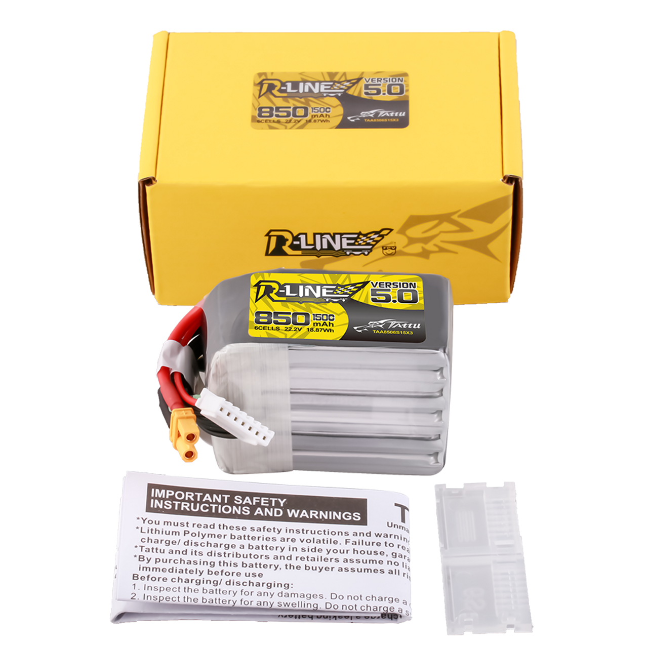 The Tattu R-Line Version 5.0 850mAh 6S 22.2V 150C LiPo Battery is built for FPV racing and freestyle pilots who demand the best. With ultra-high discharge performance and enhanced internal structure, it provides low internal resistance and maximum burst power, packed into a compact form factor.