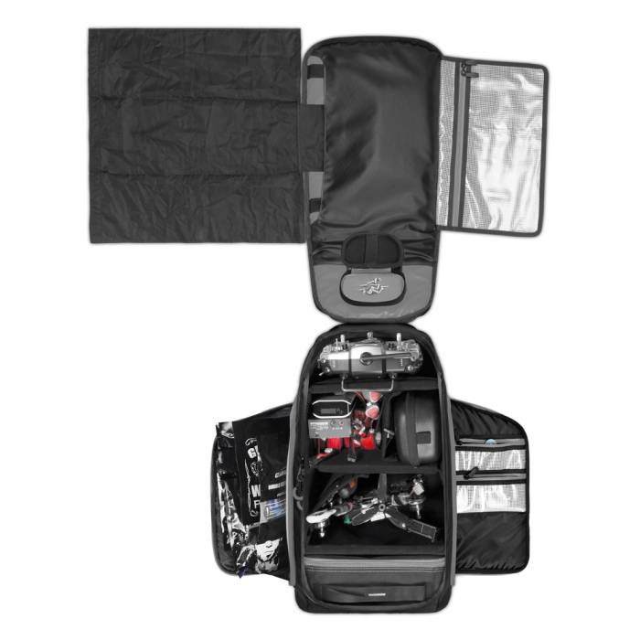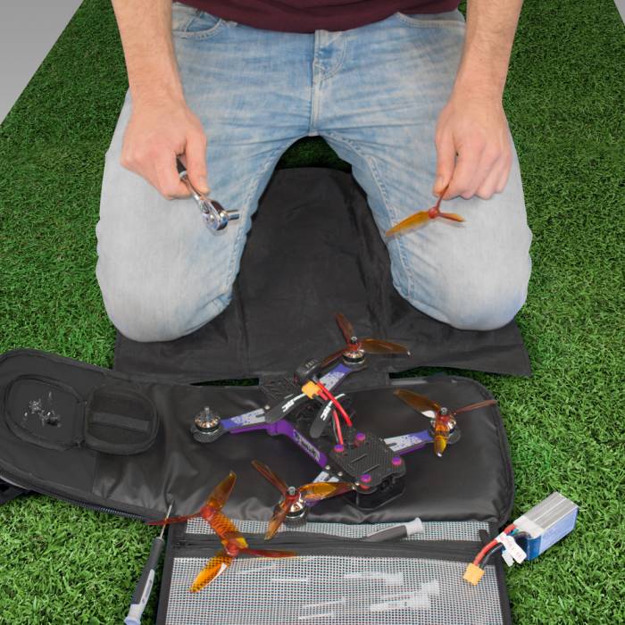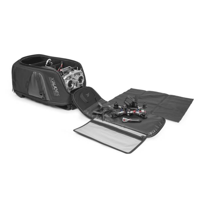 The Torvol Quad Pitstop Backpack Pro now comes in XBlades Edition! This backpack is gray in color and easily carries 4 race quadcopters and all your FPV gear, such as goggles, transmitters, LiPo’s, tools, and more. It features Torvol’s PITSTOP area, where a smart zipper transforms the backpack into a portable workspace to adjust and modify your quads quickly and effortlessly.
